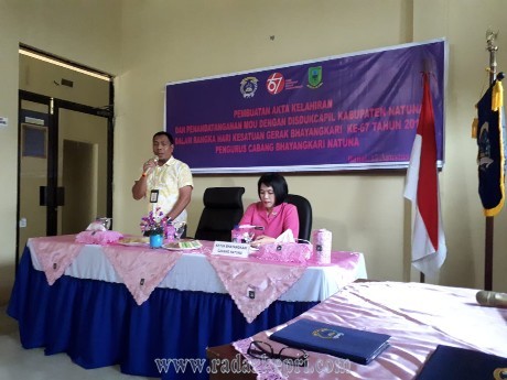 Kepala Dinas Kependudukan dan Catatan Sipil H. Ilham Kauli S. Sos, M. Si mengatakan, “Kami sangat mengapresiasi kegiatan Cabang Bhayangkari Natuna atas kepedulian kepada masyarakat Kabupaten Natuna, mulai tahun 2018 sampai dengan tahun 2019 dan kami sangat berterima kasih kepada Ibu Ketua Bhayangkari Natuna Ny. Djuariah Nugroho yang mau bekerjasama dengan kami dan sebagai wujudkan kami mengadakan MoU dengan Bhayangkari Cabang Natuna sampai dengan batas waktu selama ibu Djuariah Nugroho mejabat sbg Ketua Bhayangkari Cabang Natuna.”Ucap Ilham Kauli.