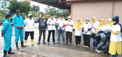 Hujan tidak menjadi kendala bagi tim untuk melakukan gotong royong menyemprotkan disinfektan door to door. Setelah selesai menyemprot disinfektan tim melanjutkan dengan memunggut berbagai sampah yang berserakan dilingkungan yang menjadi sasaran.
