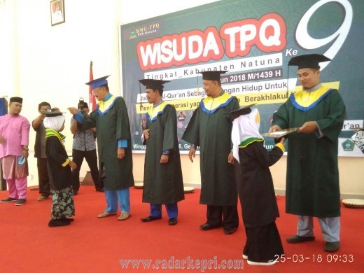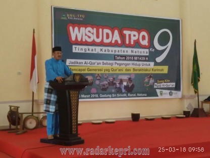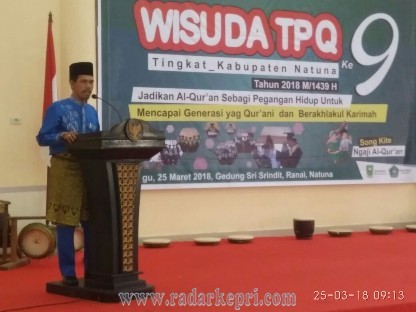 Natuna, Radar Kepri-Wisuda bersama TPQ se-Kabupaten Natuna Bunguran Minggu, (25/03) yang diselenggarakan Badan Musyawarah Guru BMG-TPQ Kabupaten Natuna dihadiri oleh Bupati Natuna, Drs. H. Hamid Rizal, M. si. dan Ketua DPRD Natuna Yusri Pandi, serta Sekda Natuna Drs. Wan Siswandi S.Sos. Kadis Pendidikan Natuna Suherman Perwakilan Kementerian Agama Natuna H. Nasoha , S. Ag, serta puluhan undangan dan ratusan wali santri lainya.