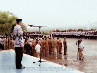 Bupati Hamid Rizal didampingi Wakil Bupati Natuna Dra Hj Ngesti Yuni Suprapti, Kepala Disdikpora Marka, Dj. S. pd. nampak semangat, sampai selesai upacara.