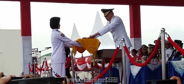 Dan petugas pengibar bendera pusaka dipercayakan kepada Paskibraka Gunawan, utusan SMAN 1 Bunguran Timur.