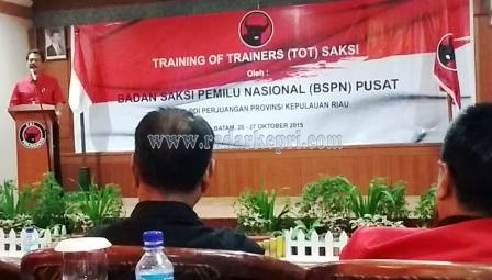 Batam, Radar Kepri-Dewan Pimpinan Daerah Partai Demokrasi Indonesia Perjuangan (DPD PDI-P) Provinsi Kepulauan Rian (Kepri) menggelar training of Trainners (TOT) saksi dengan menghadirkan nara sumber dari Badan Saksi Pemilu Nasional (BSPN) di room Pluto, hotel Planer, Batam Senin (26/10).