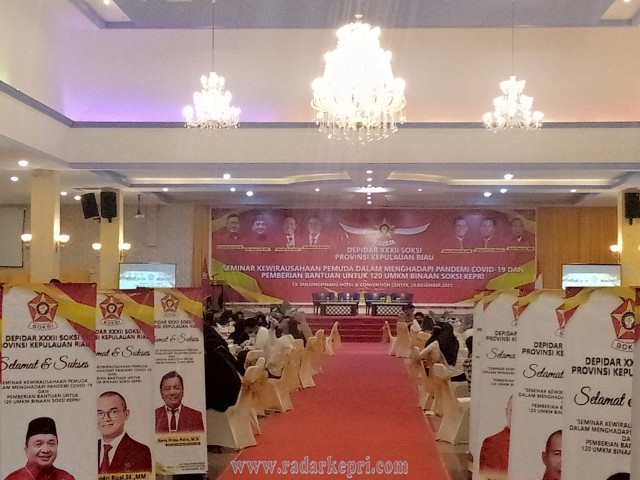 Tanjungpinang, RadarKepri – Sentral Organisasi Karyawan Swadiri Indonesia (SOKSI) melalui dewan pimpinan daerah ( Depidar ) Provinsi Kepri menggelar seminar kewirausahaan pemuda dalam menghadapi pandemic Covid-19 dan Pemberian bantuan untuk 120 UMKM Binaan SOKSI di Mega Ballroom hotel CK. Senin (20/12).