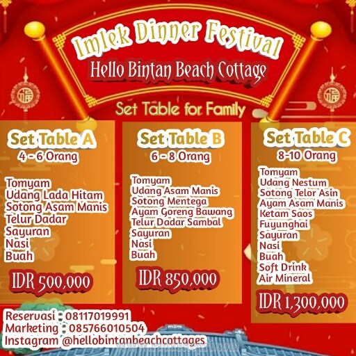 Bintan, Radar Kepri- Sempena menyambut tahun baru Imlek, Hello Bintan Beach Cottage yang berlokasi di jalan Wisata Bahari Kawal kilometer 33 Bintan Provinsi Kepulauan Riau memberikan paket promo join imlek.