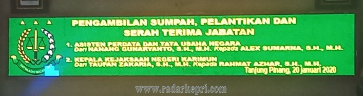 Tanjungpinang, Radar Kepri-Kepala Kejaksaan Tinggi (Kajati) Kepri, Sudarwidadi SH MH melantik Alex Sumarna SH MH sebagai Asisten Perdata dan Tata Usaha Negara (Asdatun) dan Rahmat Azhar SH MH sebagai Kepala Kejaksaan Negeri Tanjungbalai Karimun, Senin (20/01) di aula utama kantor Kejati Kepri,Sei Timun, Senggarang, Tanjungpinang.
