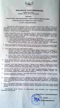 Dalam surat edaran dengan nomor 331.1/579/6.2.03/2015 dijelaskan dasar terbitnya surat edaran tersebut, yaitu berdasarkan rapat bersama forum komunikasi daerah Kota Tanjungpinang dengan Ormas Islam tentang persiapan menyambut bulan Suci Ramadhan tahun 2015.”Telah disepakati beberapa kebijakan dalam pengaturan tempat usaha hiburan dan bagi usaha tertentu selama bulan Suci Ramadhan 1436/2015 H sebagai berikut.”tulis surat edaran yang ditandatangani langsung oleh H Lis Darmansyah SH.
