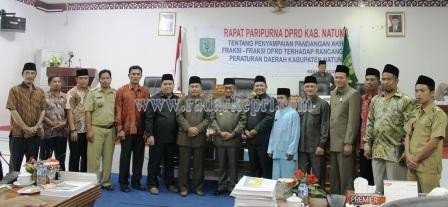 Beberapa fraksi-fraksi pada akhir pandanganya menyatakan setuju, 14 Ranperda tersebut disahkan menjadi Perda Kabupaten Natuna tahun 2014.