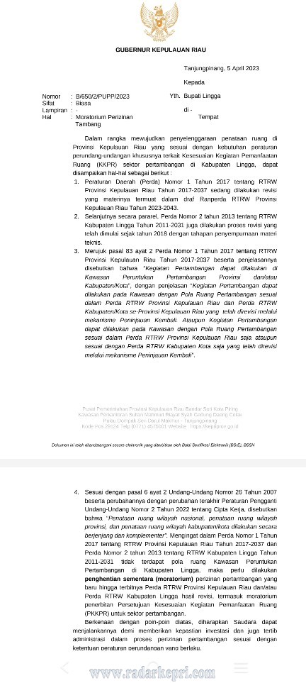 Lingga, Radar Kepri- Pada 05 April 2023 lalu, melalui surat nomor B/650/2PUPP/2023, Gubernur Provinsi Kepulauan Riau (Gubkepri), H Ansar Ahmad SE MM menerbitkan moratoriun (larangan) perizinan tambang. Surat itu ditujukan ke Bupati Lingga M Nizar SSos.