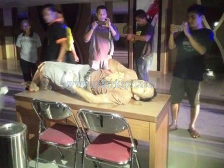 Tanjungpinang Radar Kepri-Sosok mayat laki-laki berpakaian kaus coklat, celana lives terbaring di atas meja di ruaagan lantai bawah hotel CK milik Acok di Jl R F Fisabililah batu 8 atas Jumat (19/06) malam.