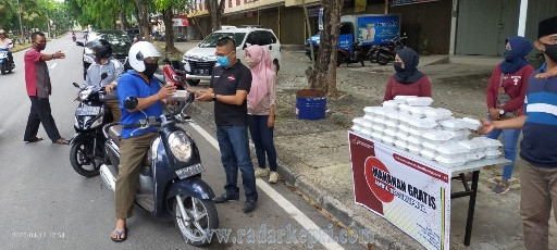 Terlihat sejumlah pengurus Melayu Raya Tanjungpinang menggunakan masker membagikan makanan siap saji untuk pengendara yang melintas di komplek Bintan Centre, Tanjungpinang.