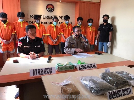 Ketujuh orang tersebut masing-masing berinisial RSP alias R, DS alias D, BN alias B, AEZ alias A, RK alias M, AK alias A dan DS alias D. Hal tersebut disampaikan oleh Kabid Humas Polda Kepri Kombes Pol Harry Goldenhardt S., S.IK., M.Si., didampingi oleh Dir Resnarkoba Polda Kepri Kombes Pol Muji Supriyadi, S.H., S.Ik., M.H. di Media Center Polda Kepri. Rabu (19/8/20).