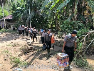 Pleton tanggap darurat Polres Solok Selatan distribusikan sembako ke wilayah hukum Sangir Batang Hari yang terkena banjir bandang,selain itu personel Polres Solok Selatan juga membantu masyarakat setempat untuk membersihkan material pasca banjir bandang yang melanda wilayah mereka.