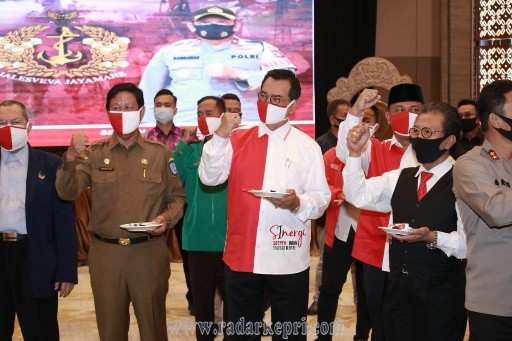 HM Soerya Respationo juga menerima secara simbolis masker merah putih yang diserahkan langsung oleh Kapolda Provinsi Kepri Irjen. Pol Dr Aris Budiman Bulo, M.Si.