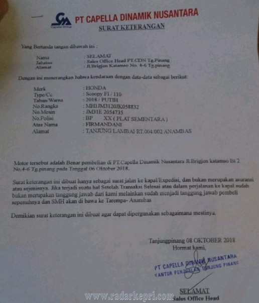 Tak bertanggungjawabnya PT Capela Dinamik Mandiri ini terungkap atas surat jawaban yang dilayangkan Firman hari ini, Jumat 25 Oktober 2018. Firman mempertanyakan sehubungan dengan pembelian motor Honda merek Scoopy dari saya (Firmanda) dengan Perusahaan saudara. (bukti pembelian terlampir).