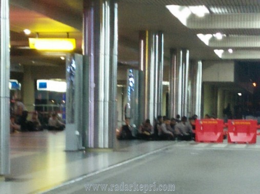 Batam, Radar Kepri- Ratusan polisi dari Polda Kepri dan Polrestata Batam masih bersiaga di Bandara Internasional Hang Nadim, Batam.