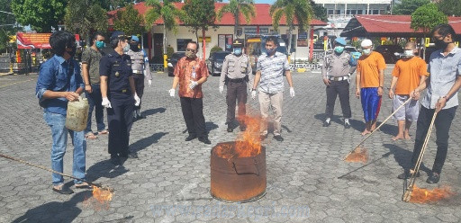Barang bukti Narkotika jenis Sabu tersebut kemudian dimusnahkan dengan cara dimasukkan ke dalam tong selanjutnya disiram dengan bensin kemudian dibakar.