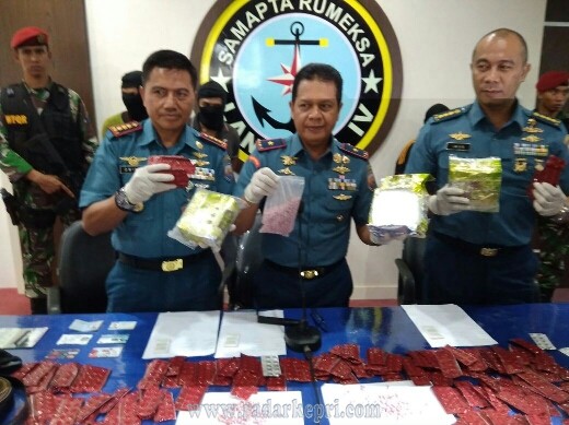 Tanjungpinang, Radar Kepri-Tim Satuan Tugas (Satgas) Anti Narkoba Western Fleet Quick Response (WFQR) IV dan Pangkalan Angkatan Laut (Lanal) Tanjung Balai Karimun (TBK) berhasil menangkap Narkoba jenis sabu-sabu seberat 3 kilogram dan pil happy fives (H5) sebanyak 2250 butir dan extasi cap play boy 2132 butir di Perairan Timur Pulau Tekong Hiu, Tanjung Balai Karimun, Jumat (20/10/2017). Narkoba tersebut dibawa tiga orang kurir menggunakan speed boat bermesin 40 PK.