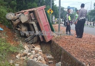 Truk yang dikemudikan Ali (39) terbalik karena rem mobilnya blong sehingga Ali terpaksa membanting stir kekiri dan menabrak parit hingga terguling.”Saya mau ke pasar antar pasir itu, tiba -tiba rem blong; kalau tak banting stir kekiri bisa menabrak pengendara motor yang ada didepan.”ucap Ali pada radarkepri.com.