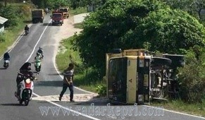 Natuna, Radar Kepri-Diduga akibat muatan terlalu berat ditambah jalan licin karena gerimis sejak pagi tadi. Truk warna kuning dengan nopol BP 9967 WU terguling di jalan tanjakan Senubing, Kecamatan Bunguran Timur, Kabupaten Natuna.