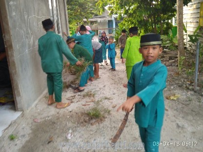 Natuna, Radar Kepri-Momen hari libur Minggu, (08/04) sekitar pukul (06.30) pagi ini usai melakukan didikan subuh sebagaimana yang selalu intruksikan oleh pihak Kantor Kementerian Agama Kabupaten Natuna sejak beberapa tahun lalu itu, Santriwan dan Santriwati Taman Pendidikan Al-Qur’an (TPQ) Al-Anshar Air Batu Tengah Kelurahan Bandarsyah Ranai, juga menyempatkan diri untuk melakukan gotong royong (goro) bersama dalam membersihkan pekarangan Mushola/Surau Babussalam Air Batu Tengah di RT. 02/RW.07.