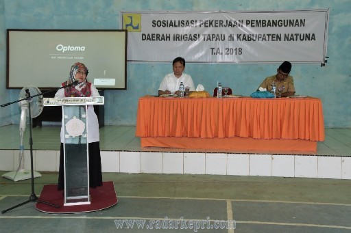 Natuna, Radar Kepri-Wakil Bupati Natuna, Ngesti Yuni Suprapti dalam sambutannya pada acara Sosialisasi Pekerjaan Pembangunan Daerah Irigasi Tapau kanan dan peningkatan Jaringan Daerah Irigasi Tapau Kiri di Kabupaten Natuna, di Balai Desa Air Lengit Kecamatan Bunguran Tengah, Selasa (03/04) pagi.