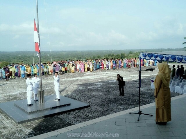 Natuna, Radar Kepri- Wakil Bupati Natuna Ngesti Yuni Supratti memimpin Apel Upacara Peringatan Hari Jadi Provinsi Kepri ke-15 di Halaman Kantor Bupati Natuna, Ranai, Senin 24 September 2017.